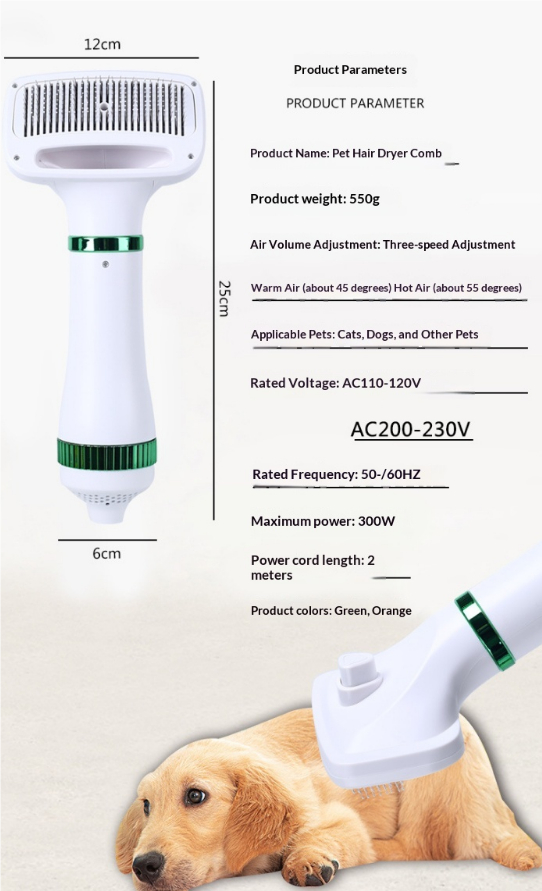 This pet blow-drying and grooming comb is designed for dogs, integrating drying, brushing, and one-button de-shedding functions into one convenient tool. It helps reduce shedding effectively and easily. Made of lightweight plastic, it comes in three color options: white, green, and pink to suit different preferences.